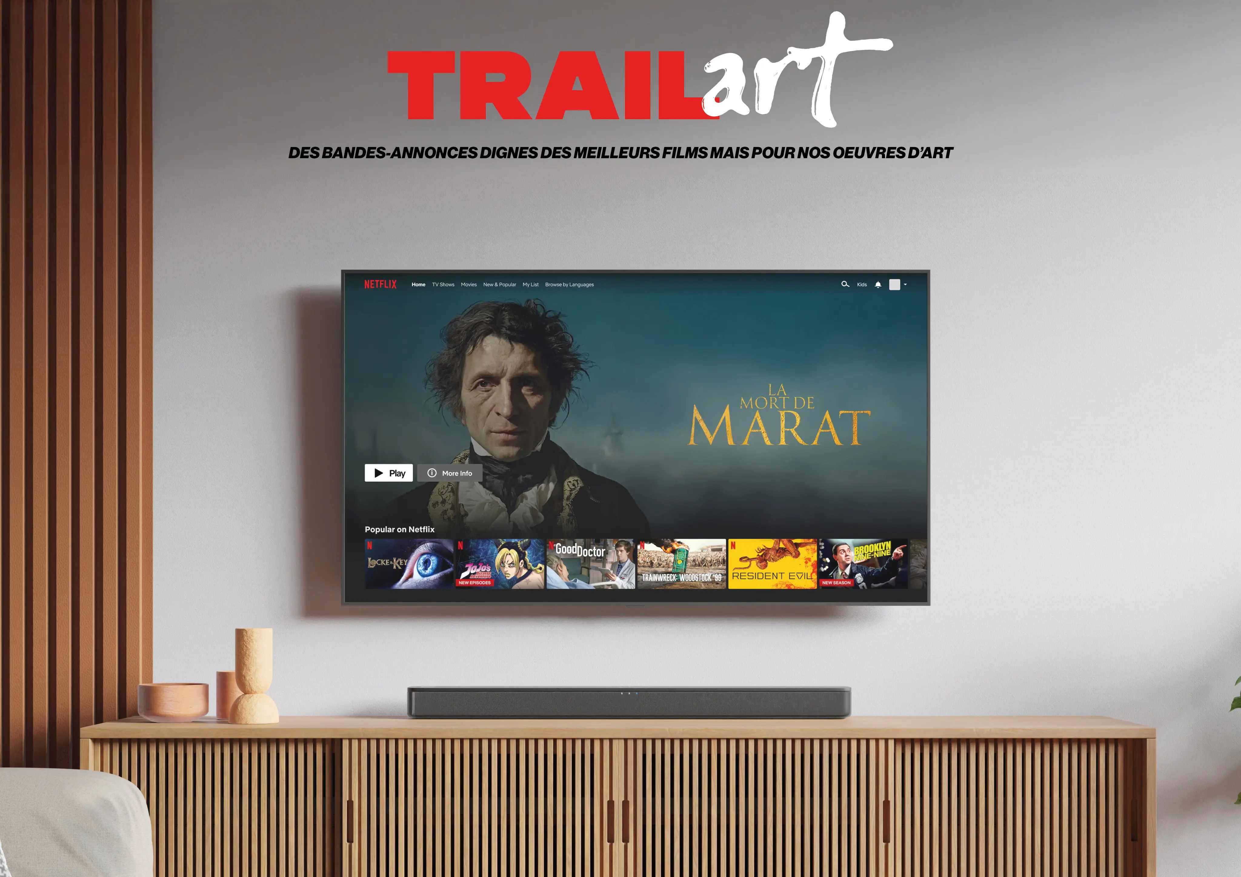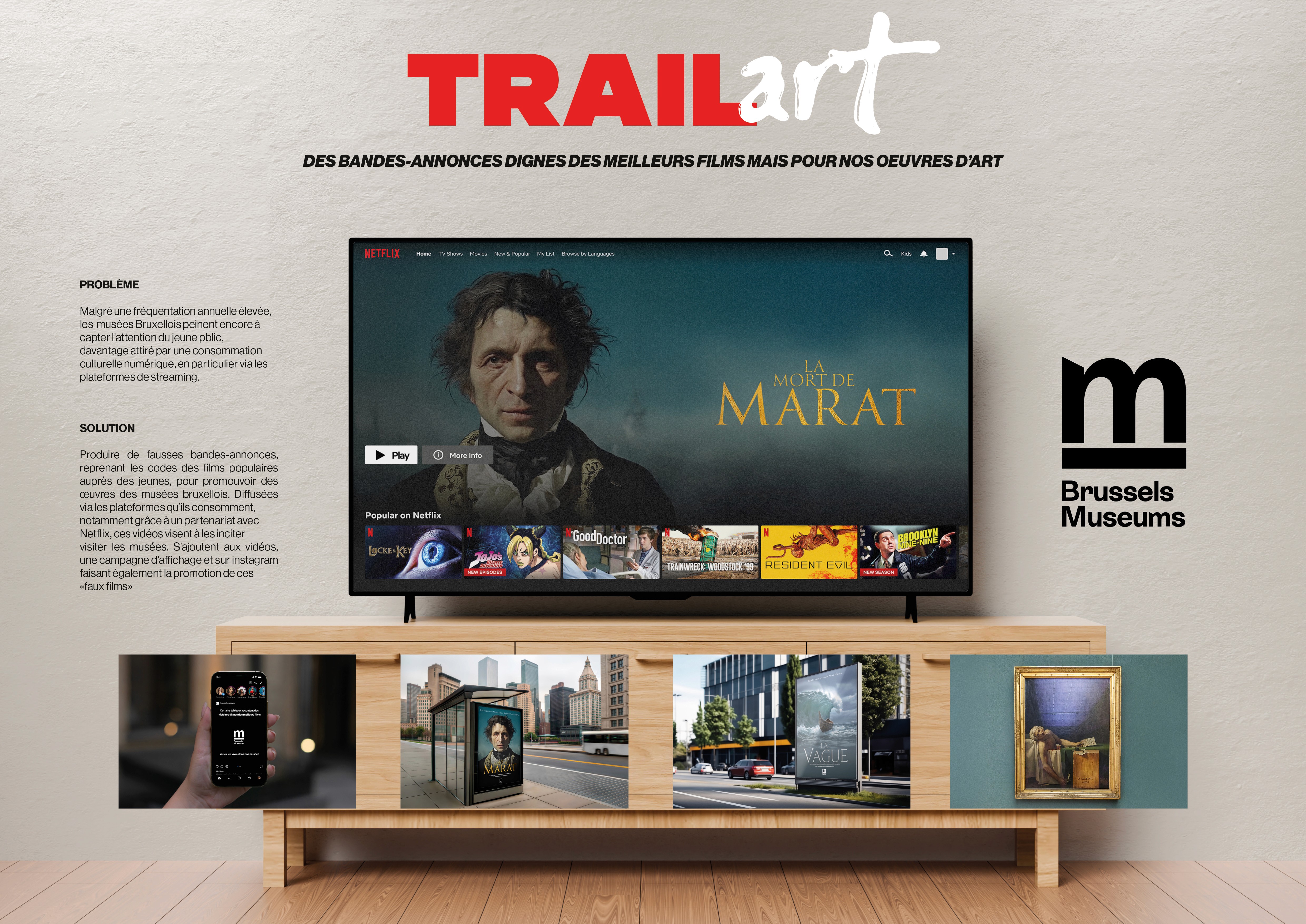 TRAILART est la campagne que j’ai réalisée pour mon jury de BAC 2. La consigne était de redonner envie aux jeunes d’aller au musée en concevant l’activation la plus créative possible. Mon idée a été de créer une campagne de promotion pour des œuvres d’art comme s’il s’agissait de blockbusters Netflix. J’ai donc réalisé une bande-annonce pour le tableau La Mort de Marat, exposé à Bruxelles. Pour y parvenir, je me suis servi de l’IA vidéo Runway, ainsi que d’After Effects et DaVinci Resolve, ce qui m’a permis d’améliorer mes compétences en prompting et en montage vidéo.
