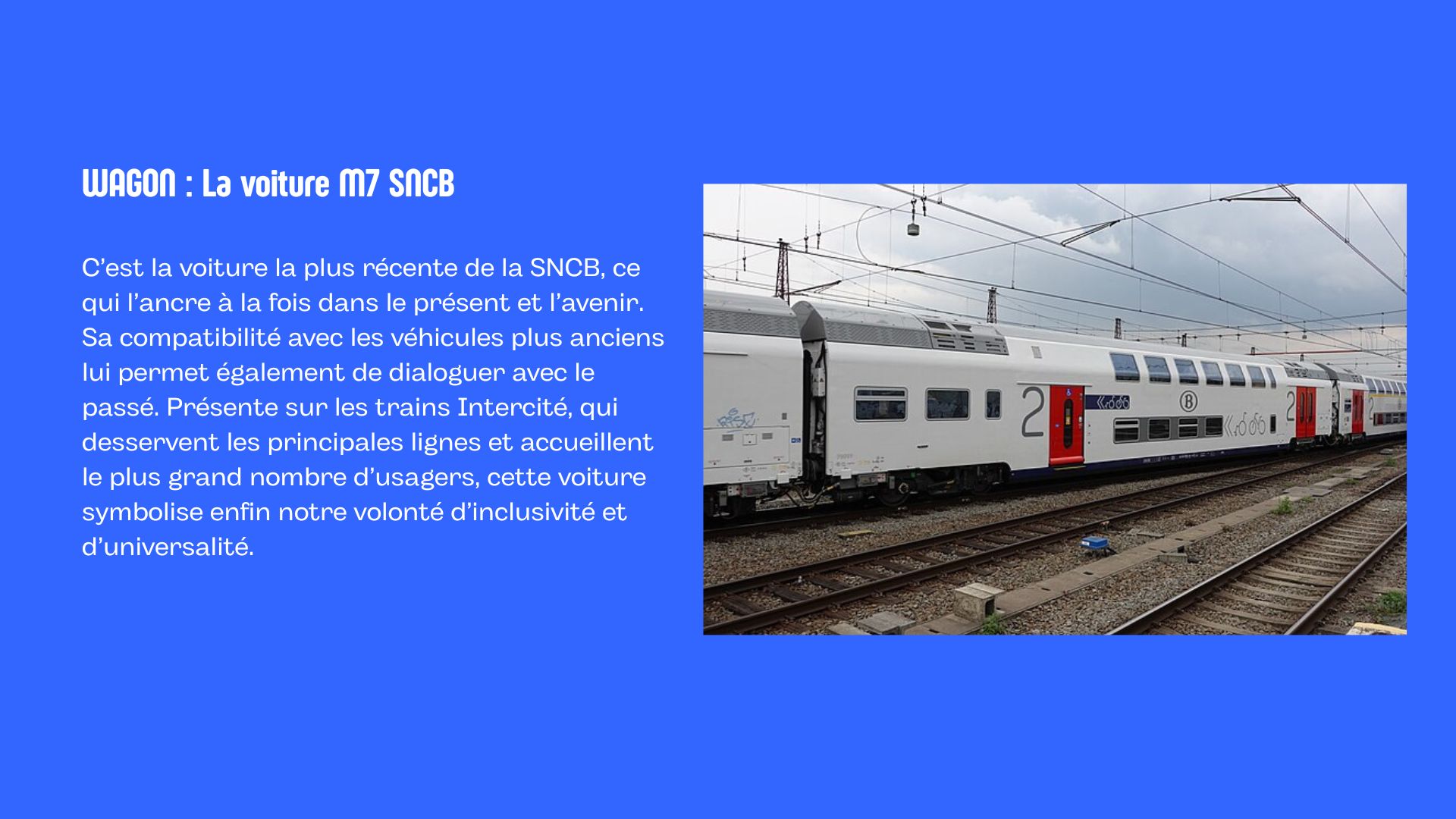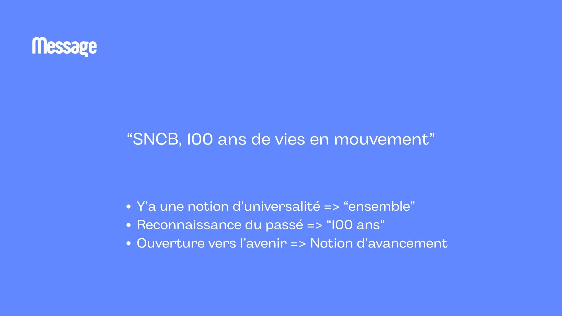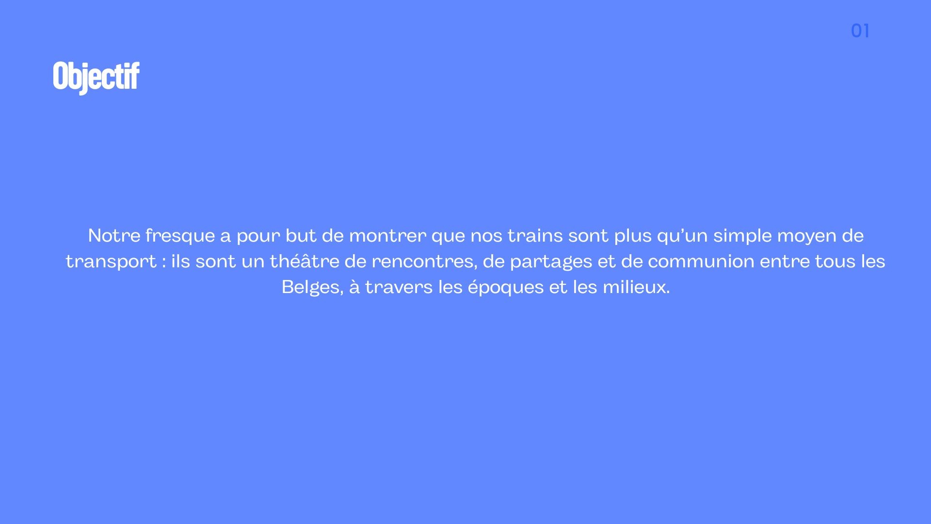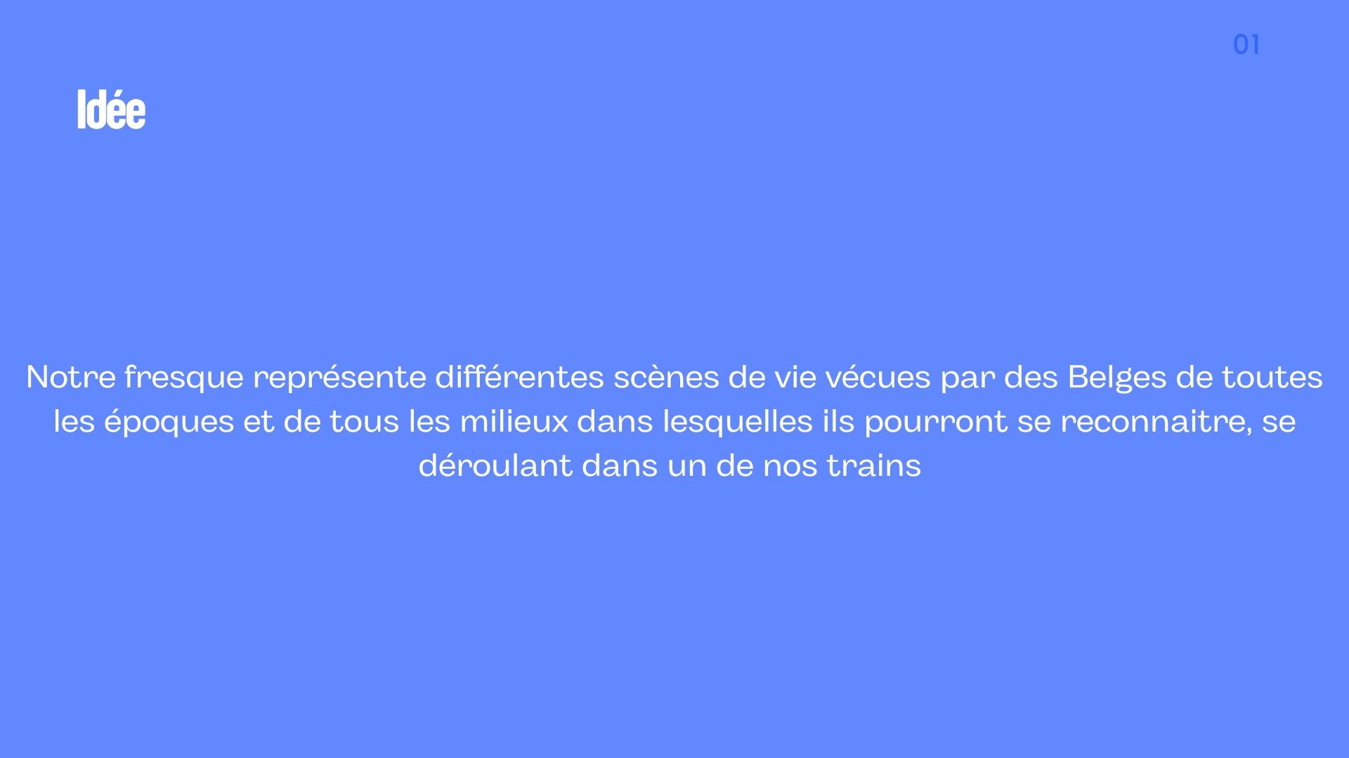 Célébrer les 100 ans de la SNCB à travers une création artistique qui honore le passé, reflète le présent et imagine l’avenir du voyage en train, exprime les émotions du trajet et valorise le train comme mobilité durable, humaine et connectée.