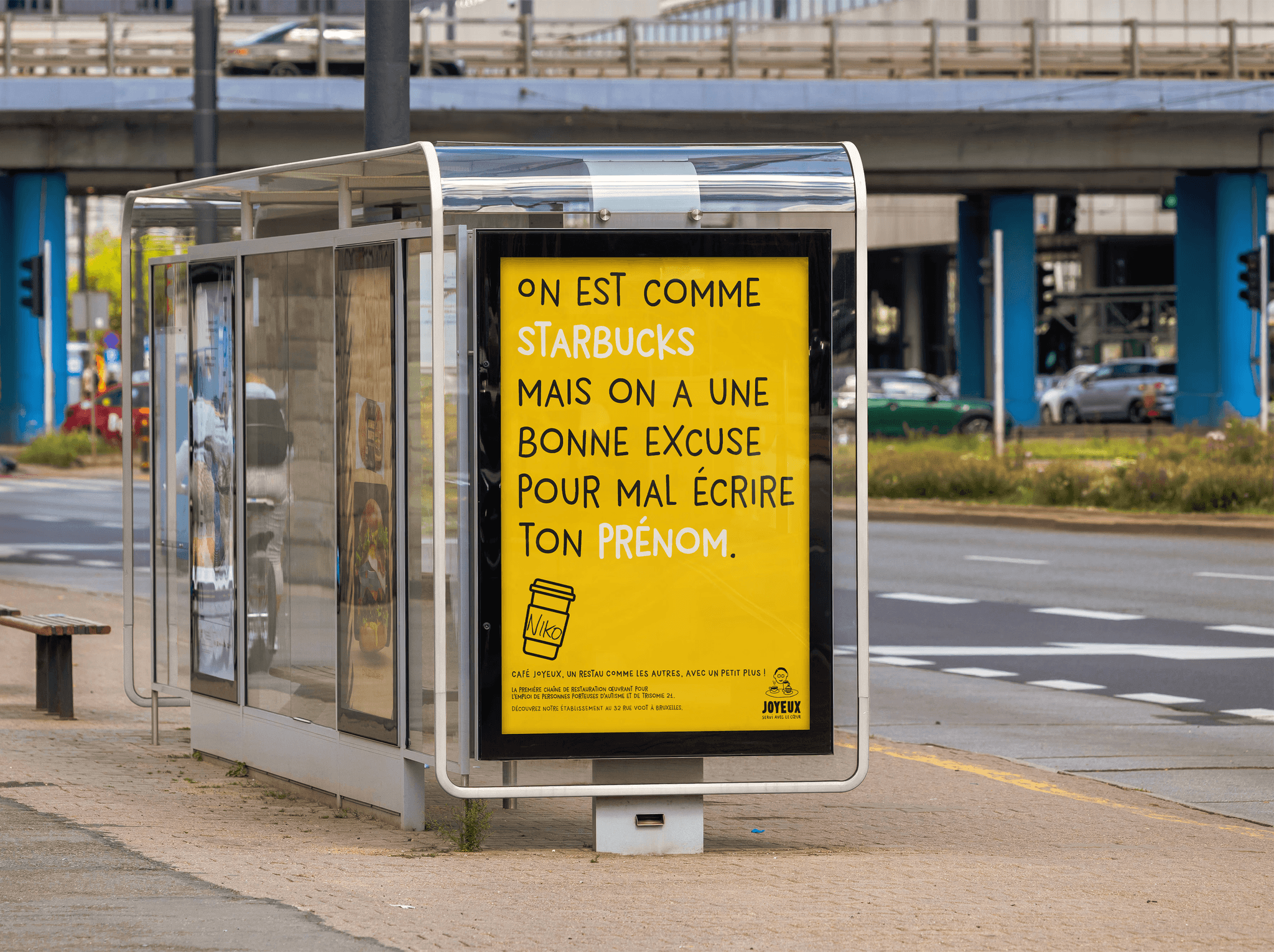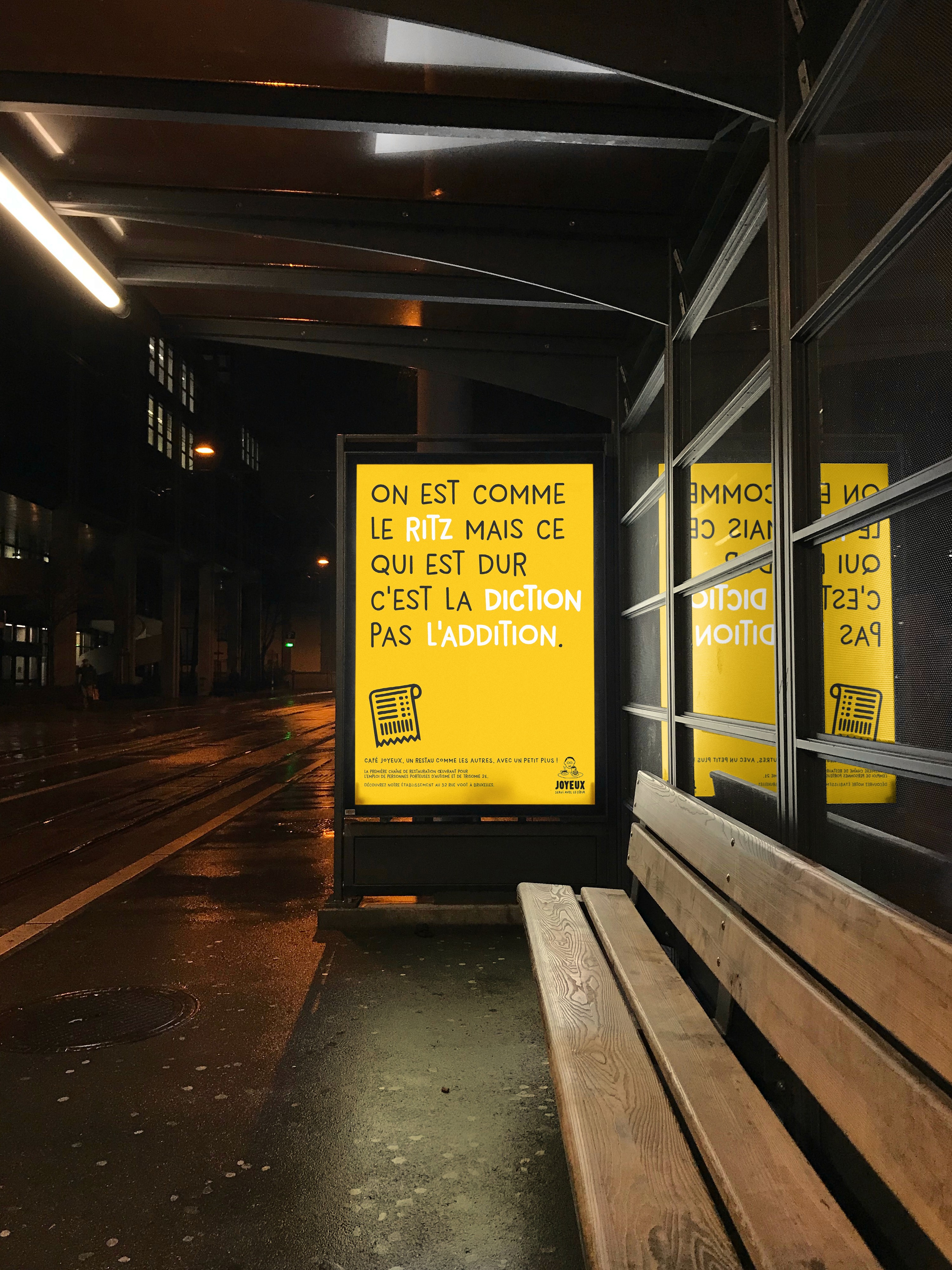 Une autre campagne copy. Celle-ci a été réalisée en collaboration avec mon pote Arnaud André. L’objectif était de créer une campagne d’awareness pour le Café Joyeux, un restaurant employant des personnes en situation de handicap mental et cognitif.