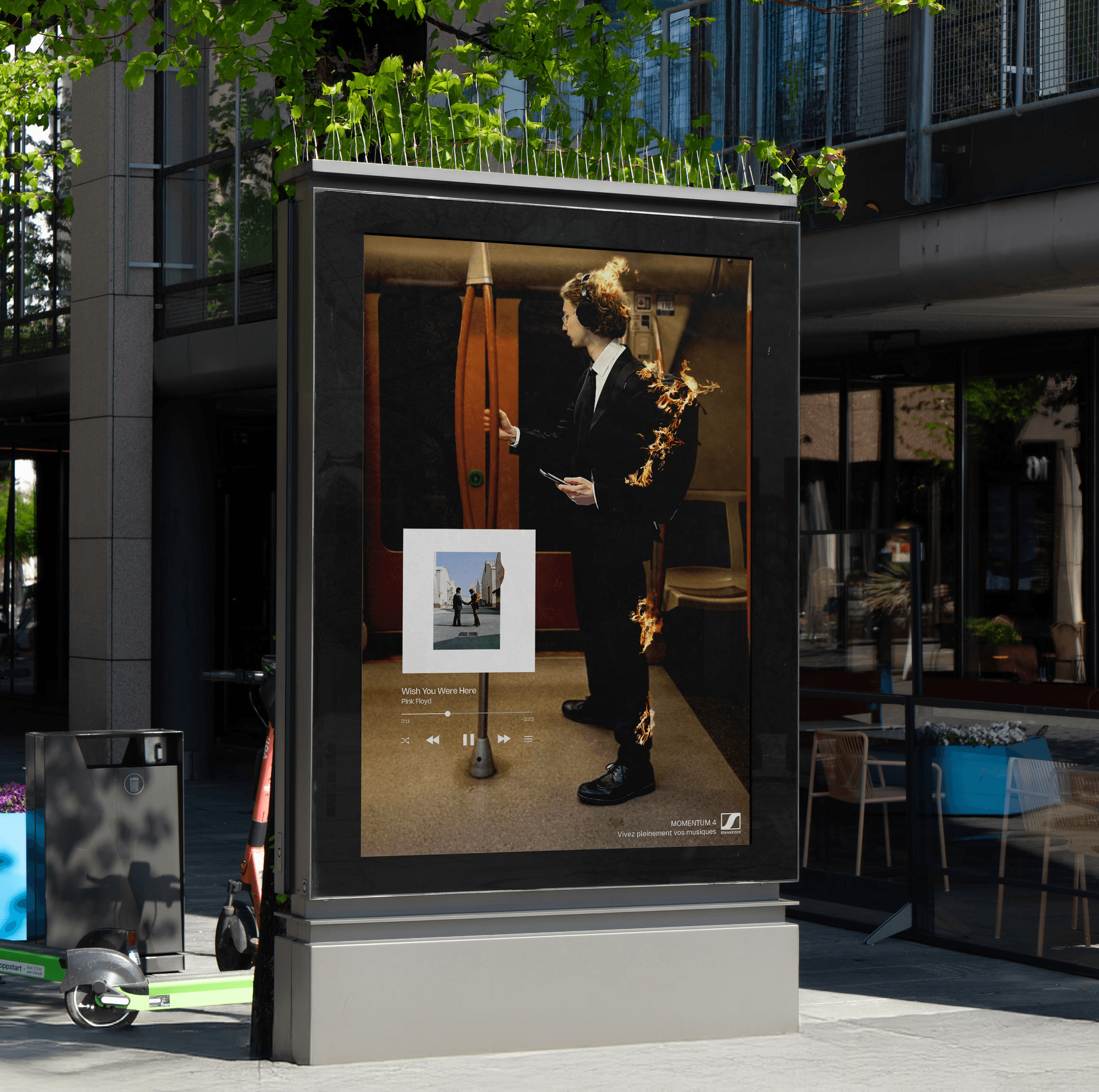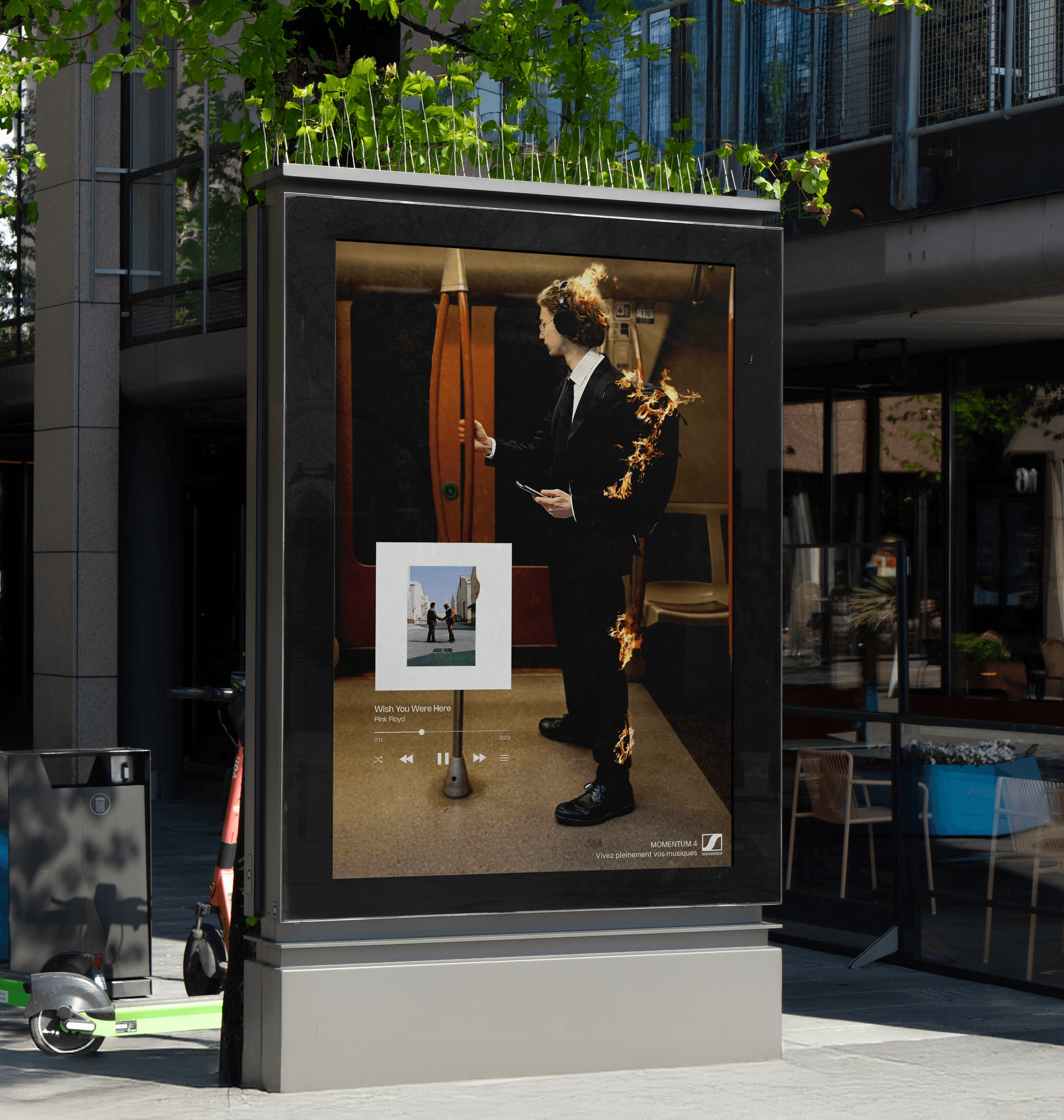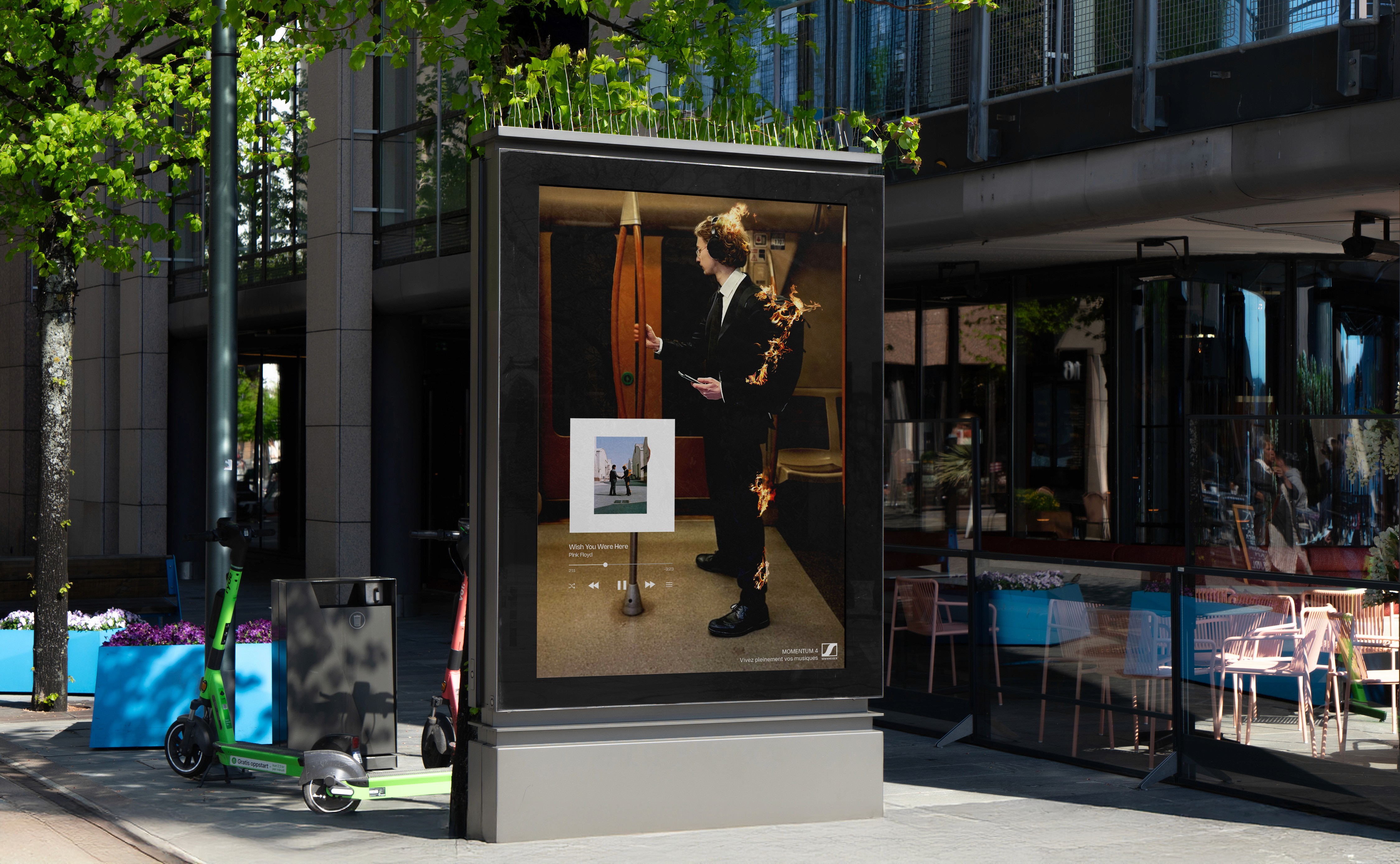 La meilleure DA que j’aie réalisée pour une affiche ! La consigne était simple : montrer que le Sennheiser MOMENTUM 4 est le casque le plus immersif au monde. Pour ça, j’ai décidé de l'illustrer avec des visus inspirés de pochettes d’albums célèbres impactant directement le porteur du casque.